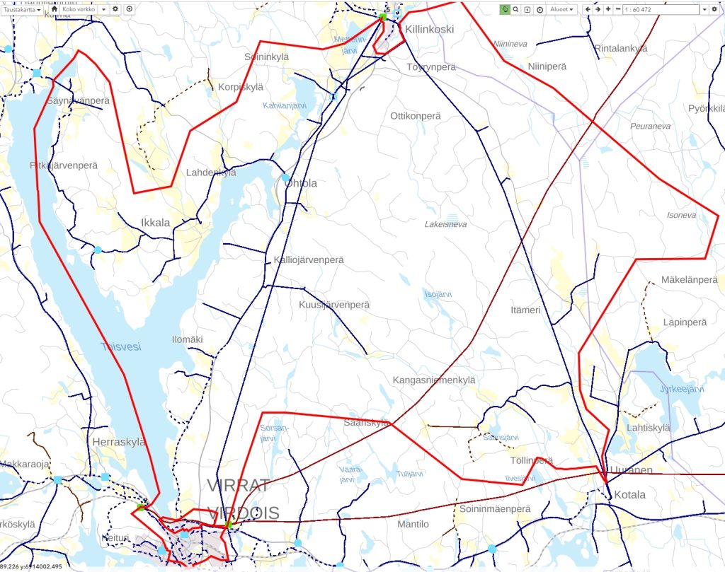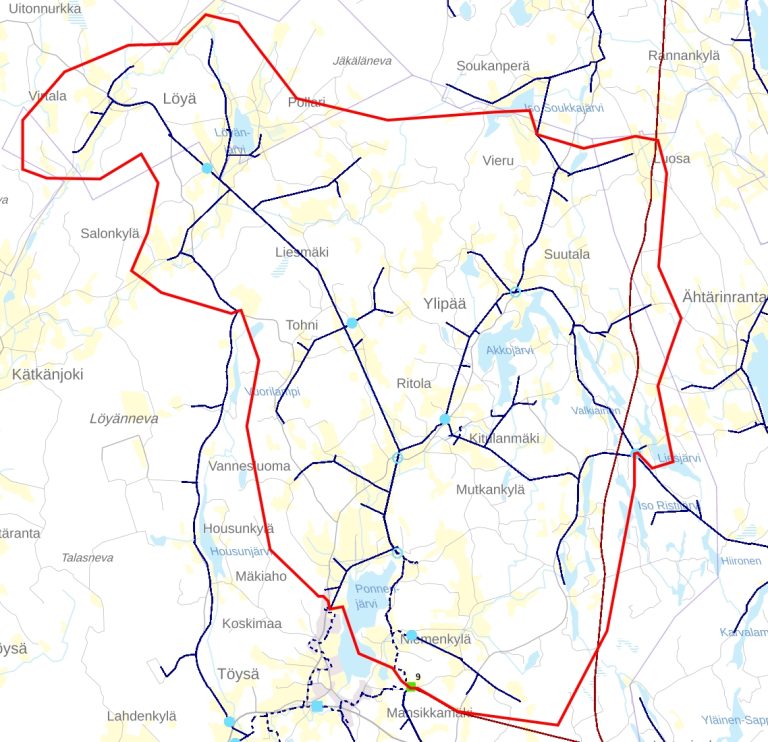Vuoden 2026 aikana ilmajohtolinjojen raivauksia toteutetaan useilla alueilla. Raivausalueet on merkitty karttaan punaisella. Työt kohdistuvat sekä 20 kV:n keskijännitelinjoihin että 0,4 kV:n pienjännitelinjoihin, ja niiden tavoitteena on varmistaa sähkönjakelun toimitusvarmuus sekä ehkäistä sääolosuhteista johtuvia häiriöitä.